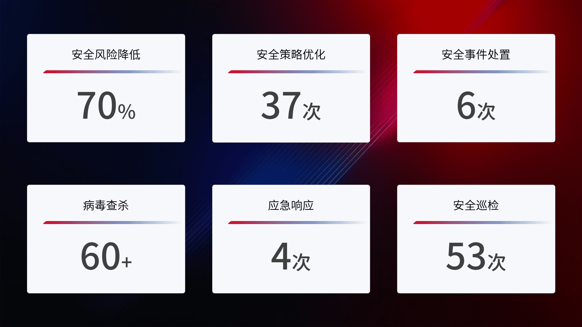 提供全面的安全事件报告体系,,包括处置报告、、、、周报、、、季度和年度总结,,结合持续监控,,帮助客户深入了解网络安全状况。。。。