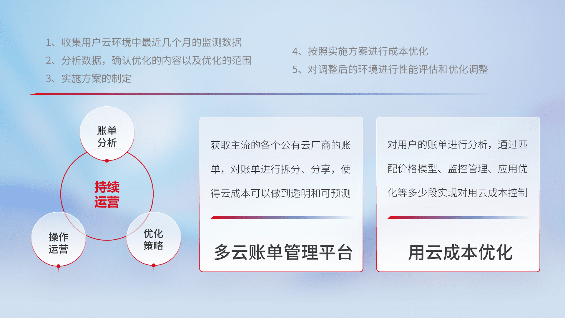 通过多云纳管,,以统一的资源数据模型把客户的云资源进行抽象和封装,,,进而实现对多云资源的统一操作,,保障云资源管理的可靠性、、稳定性与可用性。。。量身定制化运维内容,,配置、、、开发运维、、、补丁管理、、、备份、、、监控、、认证和访问管理、、、审计和日常巡检等,,,保障在用云过程中的可靠度,,,稳定度以及高可用率。。。