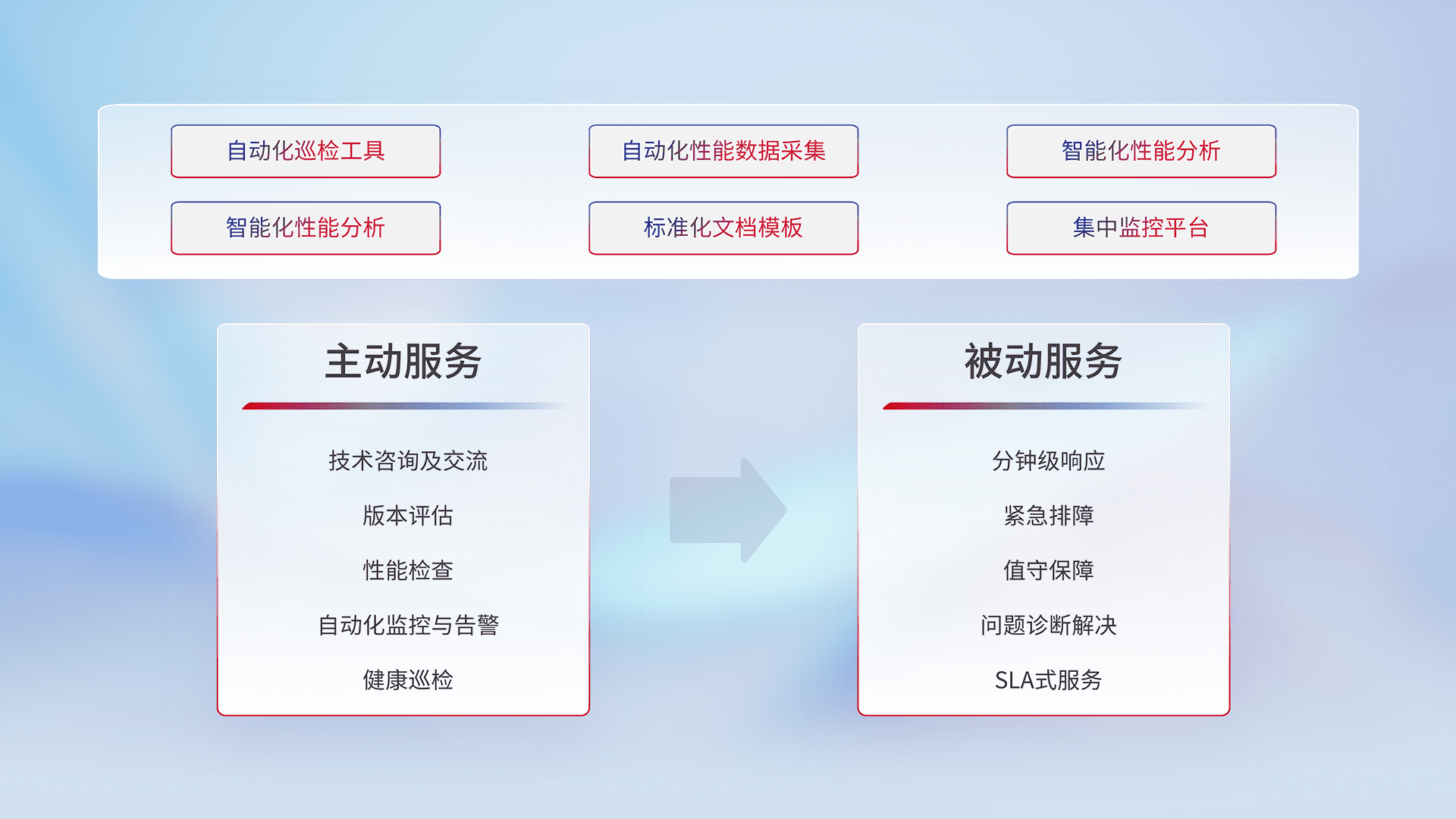 智能化工具和标准化文档,,保障服务质量,,,,提供主动服务(包含技术咨询、、、版本评估、、、、性能检查、、、、自动化监控与告警、、健康巡检)和被动服务包含(分钟级响应、、、、紧急排障、、、值守保障、、问题诊断解决、、、、SLA服务)。。。。