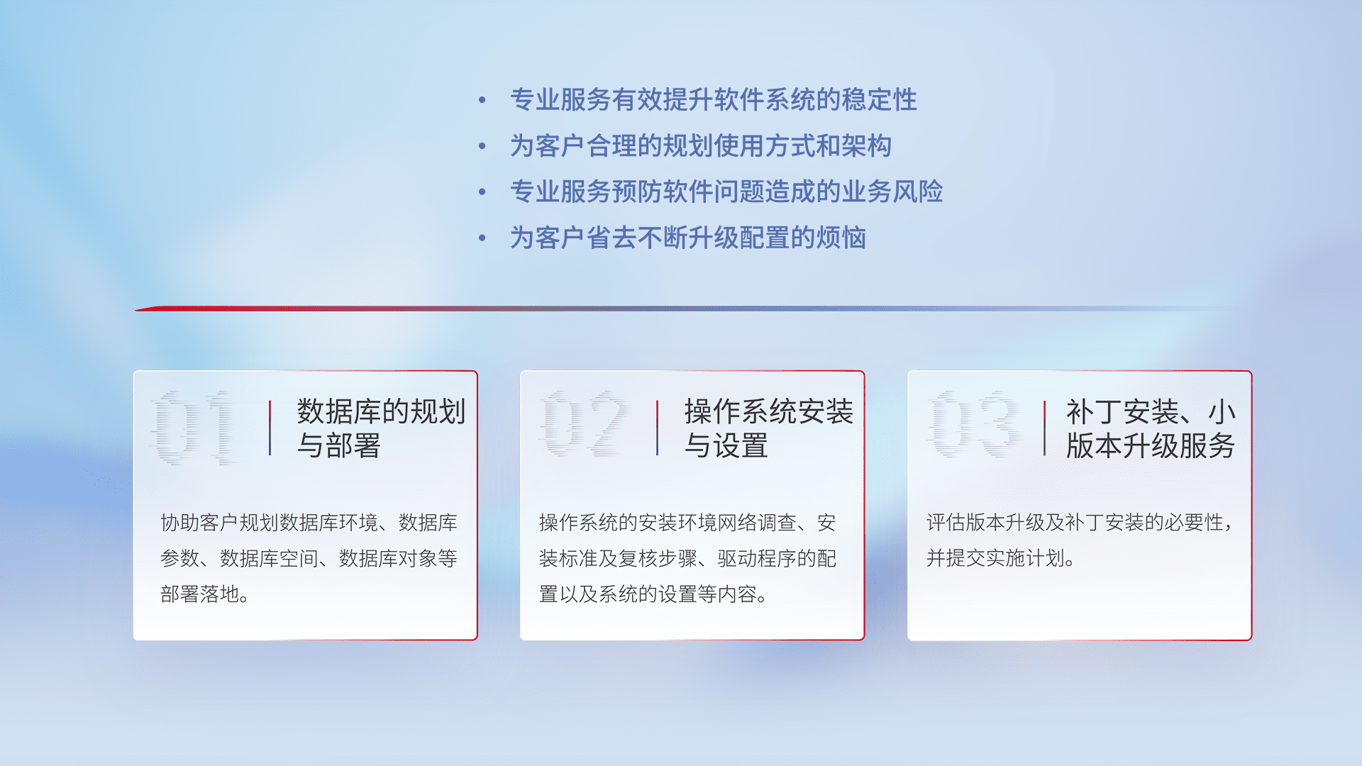 为客户提供软件规模升级、、、、快速部署、、、按需配置的专业服务,,,从数据库的规划与部署到操作系统的安装与设置,,,,再到补丁安装和小版本升级提供支持。。。